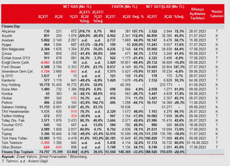 Aselsan'da, 2023 yılının ikinci çeyreğinde döviz kurlarında yaşanan yükselişin karlılığı destekleyebileceğini düşünüyoruz. Ayrıca döviz fazla pozisyonuna istinaden kur farkı gelirlerinin de karlılığa olumlu katkı yapabileceğini tahmin ediyoruz. Otokar'da satışlarda adetsel büyüme ile birlikte ciro ve karlılıkta daha iyi rakamlar görülebilir. Tüm bu gelişmelere bağlı olarak yaptığımız tahminlere göre takibimizdeki banka dışı şirketlerde, toplam karın 2023 yılının 2. çeyreğinde 74.797mn TL seviyesinde gerçekleşeceğini ve yıllık %0,8 oranında azalacağını öngörüyoruz. Kaydedilmesi öngörülen bu düşüşte Erdemir ve İsdemir'deki zarar ile Tüpraş'ın karının yıllık olarak gerileyeceği beklentileri önemli etkenlerdir. THY, İş GYO ve Sabancı Holding ise yıllık artışlarda pozitif ayrışmışlardır. Bir önceki çeyreğe göre bakıldığında ise, THY, Sabancı Holding ve İş GYO'daki kar artışları toplam çeyreklik kar atışında belirleyici olmuşlardır. Diğer taraftan, Erdemir, Türk Telekom ve Ülker'deki zarar beklentileri kar oluşumunda olumsuz etki etmiştir.