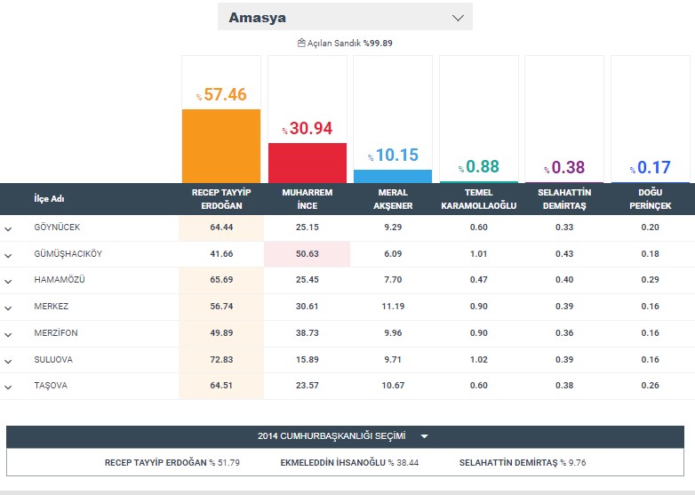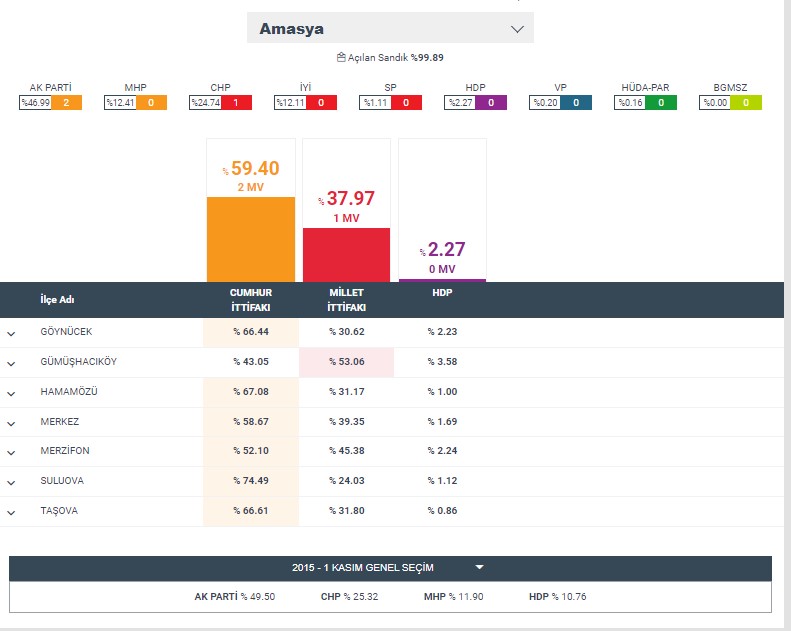 AMASYA CUMHURBAŞKANLIĞI SEÇİM SONUÇLARI 2018 CUMHUR İTTİFAKI VE MİLLET İTTİFAKI OY ORANLARI