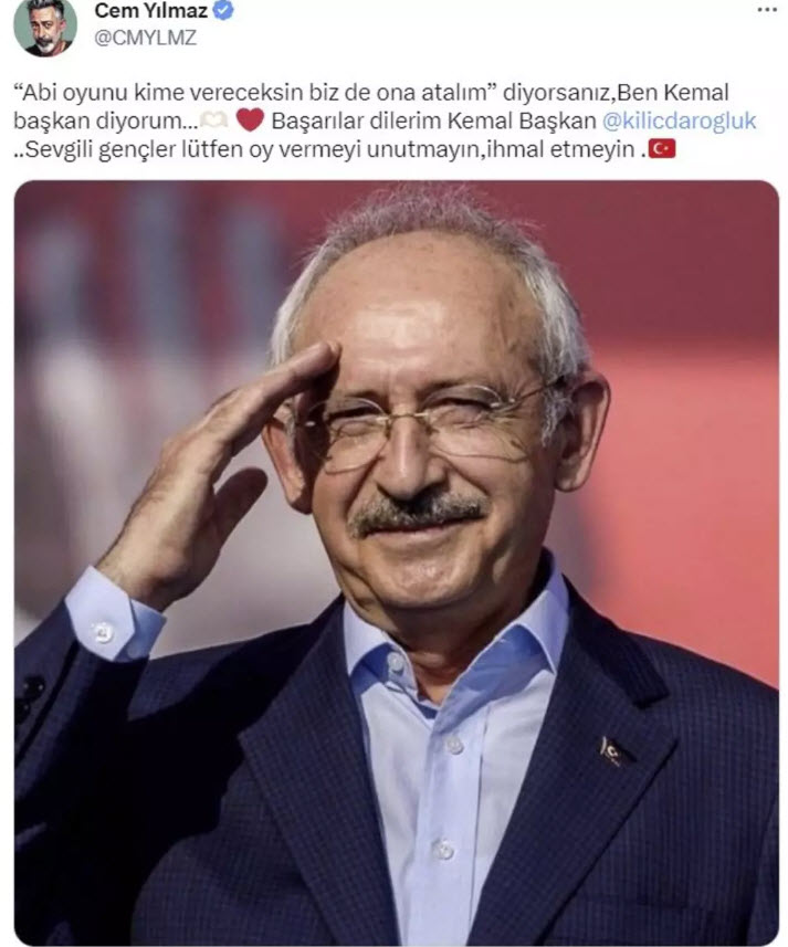 Cem Yılmaz sosyal medya hesabı Twitter'dan oyunu kime atacağını açıkladı. Hayranları için bir paylaşım yapan Yılmaz, "Abi oyunu kime vereceksin biz de ona atalım” diyorsanız,Ben Kemal başkan diyorum! Başarılar dilerim Kemal Başkan @kilicdarogluk.. Sevgili gençler lütfen oy vermeyi unutmayın,ihmal etmeyin." ifadelerini kullandı.
