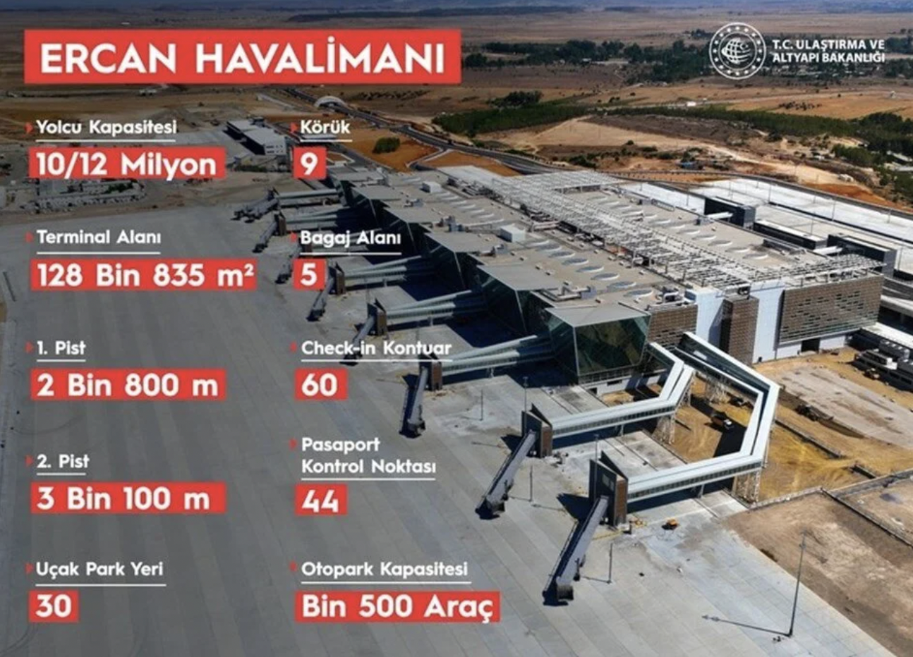 ,9 körük, 21 de açıkta olmak üzere toplam 30 uçaklık park alanı bulunan Ercan Havalimanı, 1500 araç kapasiteli kapalı otoparkı ve son teknoloji yeni donatılarıyla hizmet sunacak. Havaalanı, turizme ve ekonomiye de önemli katkı sağlayacak.