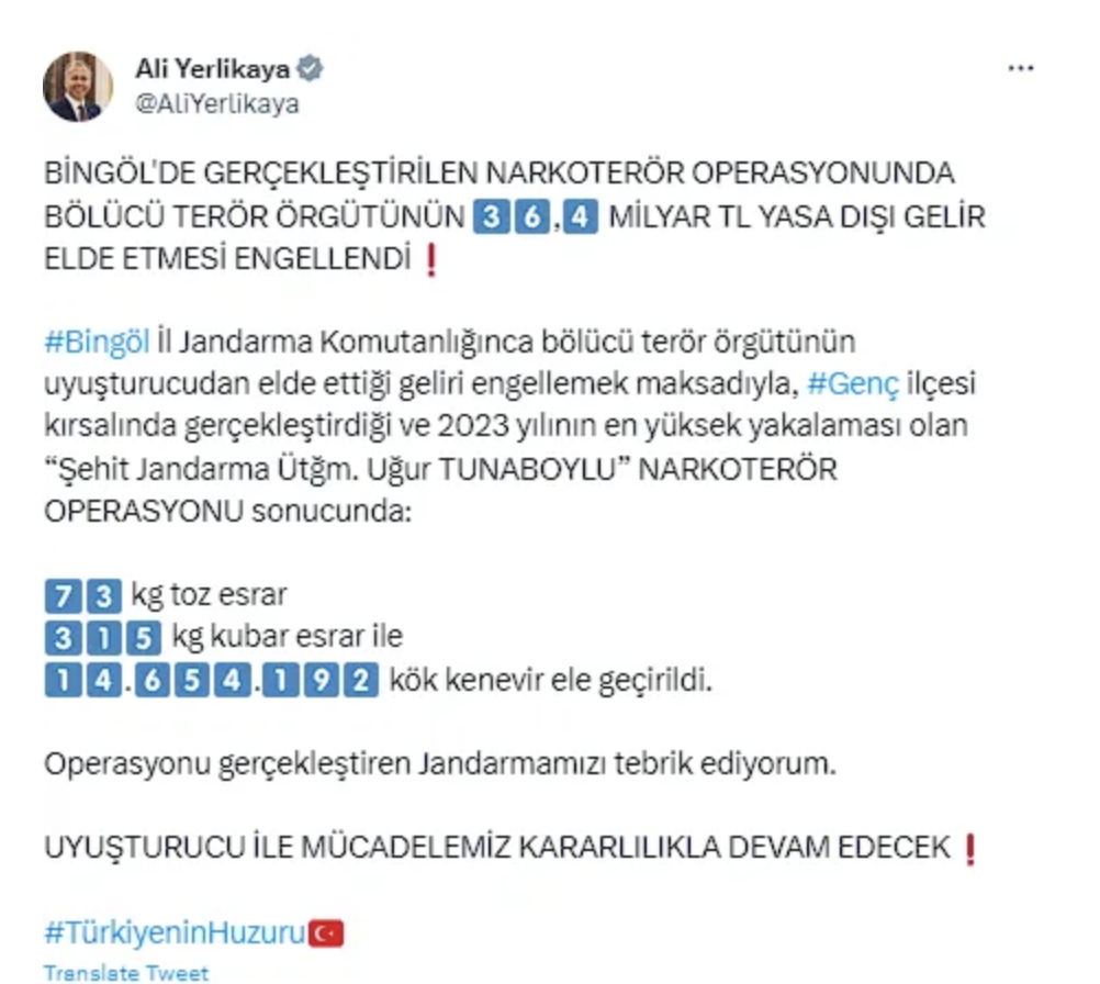 İçişleri Bakanı Ali Yerlikaya sosyal medya hesabından yaptığı paylaşımda, "Bingöl'de gerçekleştirilen Narkoterör operasyonunda bölücü terör örgütünün 36,4 milyar Türk lirası yasa dışı gelir elde etmesi engellendi.