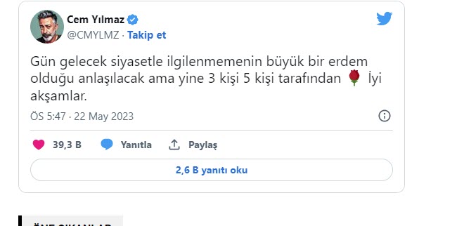 Oğan'ın açıklamalarının ardından Cem Yılmaz dikkat çeken bir paylaşım yaptı. Yılmaz sosyal medya hesabı Twitter'dan yaptığı paylaşımında, "Gün gelecek siyasetle ilgilenmemenin büyük bir erdem olduğu anlaşılacak ama yine 3 kişi 5 kişi tarafından İyi akşamlar" sözlerine yer verdi.