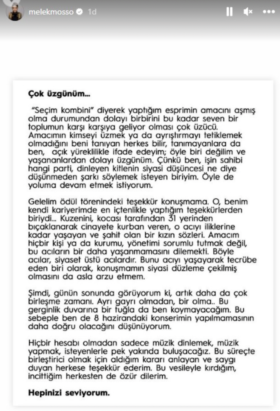 Bazı kullanıcıların "Melek Mosso'nun konserleri iptal edilsin" yorumlarıyla ilgili de konuşan ünlü isim, sözlerine şöyle devam etti: "Şimdi, günün sonunda görüyorum ki, artık daha da çok birleşme zamanı. Ayrı gayri olmadan, bir olma.. Bu gerginlik duvarına bir tuğla da ben koymayacağım. Bu sebeple ben de 8 hazirandaki konserimin yapılmamasının daha doğru olacağını düşünüyorum. Hiçbir hesabı olmadan sadece müzik dinlemek, müzik yapmak, isteyenlerle pek yakında buluşacağız. Bu süreçte birleştirici olmak için aldığım kararı anlayan ve saygı duyan herkese teşekkür ederim. Bu vesileyle kırdığım, incittiğim herkesten de özür dilerim. Hepinizi seviyorum."