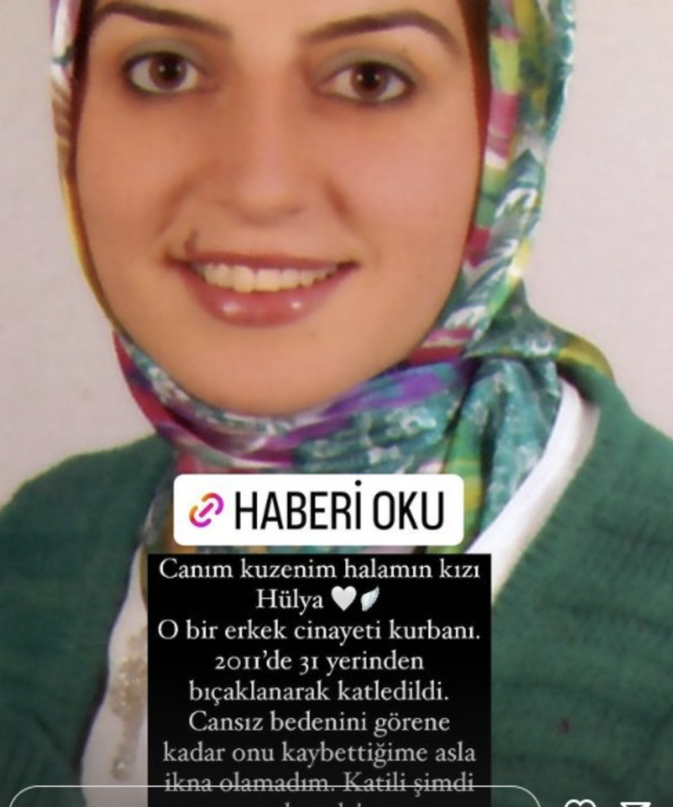 Daha sonra 2011 yılında katledilen halasının kızı Hülya'dan bahseden Melek Mosso, "Canım kuzenim, halamın kızı Hülya... O bir erkek cinayeti kurbanı. 2011'de 31 yerinden bıçaklanarak katledildi. Cansız bedenini örene kadar onu kaybettiğime asla ikna olamadım. Katili şimdi dışarıda" ifadelerini kullandı.