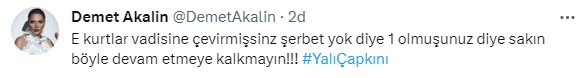 Twitter hesabından Kızılcık Şerbeti'nin yayın cezasından dolayı Yalı Çapkını'nın birinci olduğunu söyleyen Akalın, "E Kurtlar Vadisi'ne çevirmişsiniz. Kızılcık Şerbeti yok diye birinci olmuşsunuz diye sakın böyle devam etmeye kalkmayın" ifadelerini kullandı.