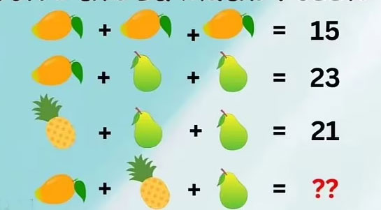 Muammayı çözmek için, her bir meyvenin değerini belirlemeniz yeterlidir. Yani üç mango toplam 15 ise, bu her birinin beşe eşit olduğu anlamına gelir.