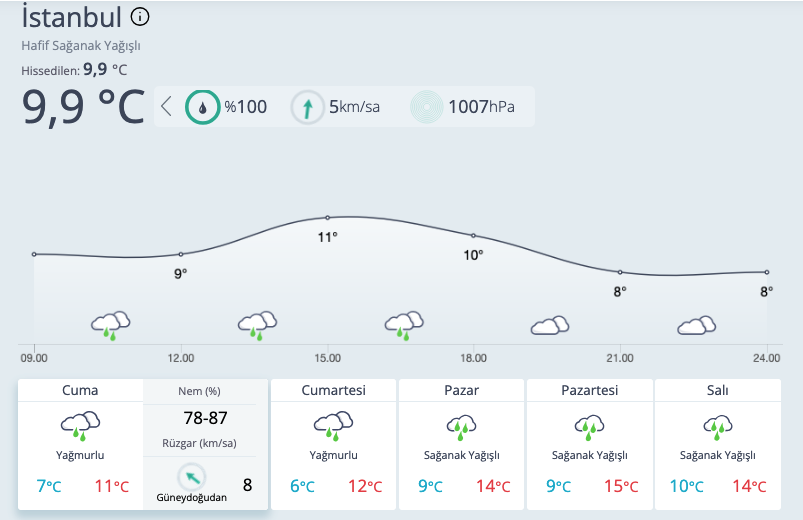 Bugün, yani 23 Ocak Cuma günü ise İstanbul güne %100’lük tam bir nem oranı ve %75 oranında bulutlu bir gökyüzüyle başladı. Güncel ölçümlere göre sıcaklığın gün boyu 10°C civarında sabit kalacağı tahmin edilirken, rüzgâr güneyden saatte yaklaşık 2 kilometre hızla oldukça hafif bir şekilde esmeye devam ediyor.