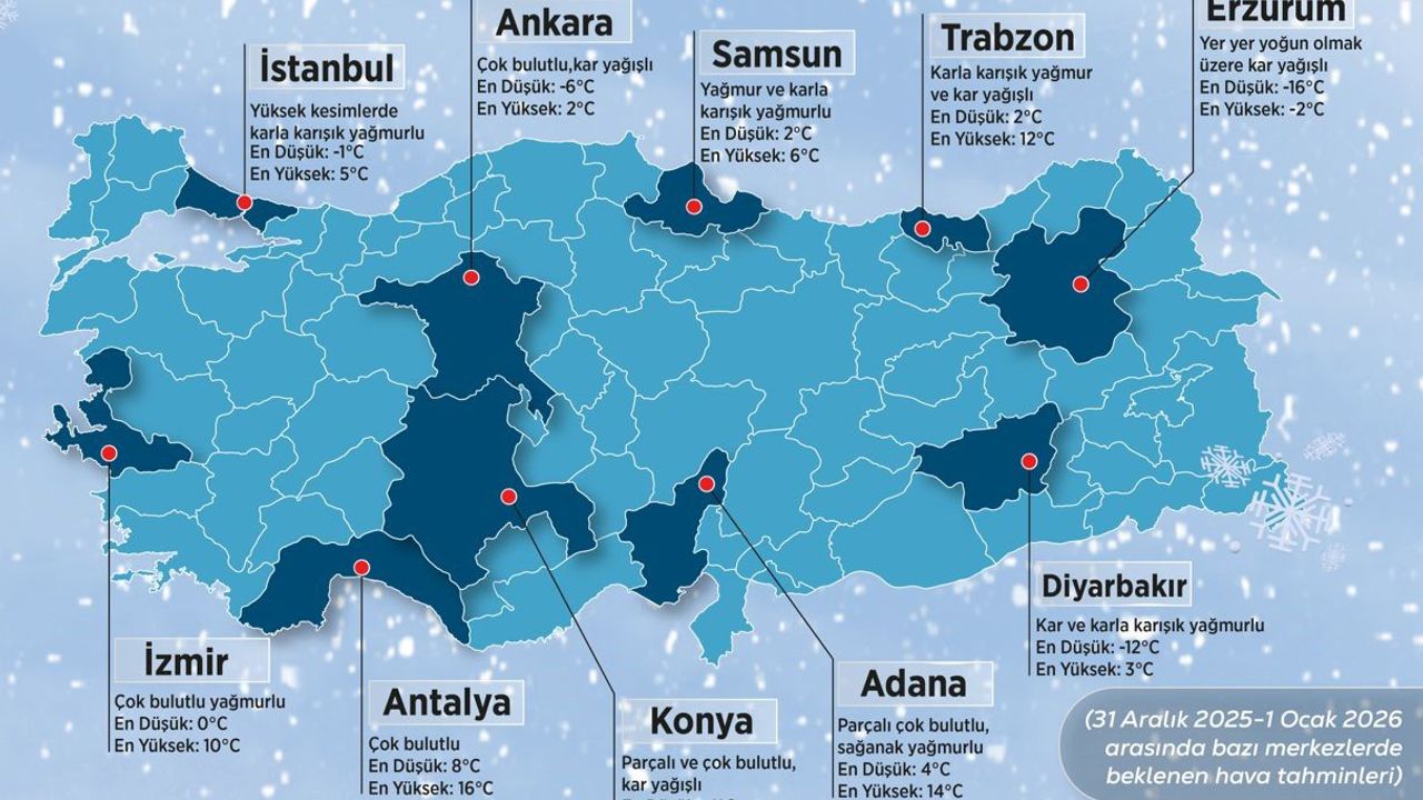 Meteoroloji Genel Müdürlüğü tahminlerine göre 2025'in son günü ile yeni yılın ilk günü Türkiye genelinde soğuk ve yağışlı hava etkili olacak. Yağışların Akdeniz ve Ege Bölgesi kıyı kesimlerinde yağmur ve sağanak, Karadeniz kıyılarında karla karışık yağmur, iç kesimlerde ise kar şeklinde olacağı tahmin ediliyor.