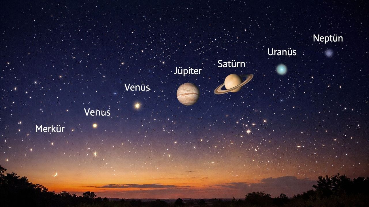 Merkür, Venüs, Jüpiter ve Satürn’ün çıplak gözle izlenebileceği, Uranüs ve Neptün’ün ise teleskopla görülebileceği “gezegen geçidi”, 28 Şubat’ta gün batımından sonra batı ufkunda nadir bir gökyüzü şöleni sunacak.