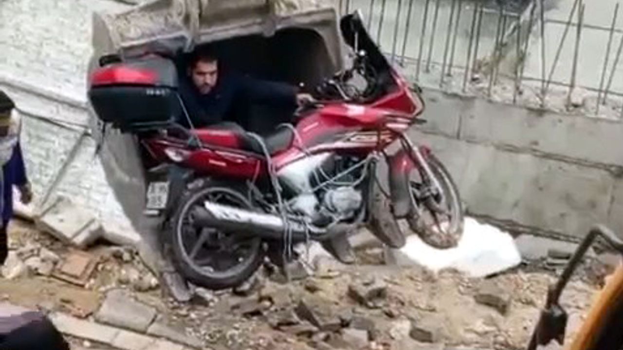 Olay, dün Cihangir Mahallesi’nde meydana geldi. Yol kenarına park edilen motosiklet, rüzgarın etkisiyle dengesini kaybederek bitişikteki inşaat alanına düştü. Motosikletinin düştüğünü fark eden sürücü, inşaatta çalışan işçilerden yardım istedi. Kendi imkanlarıyla motosikleti çıkaramayan işçiler, inşaatta kullanılan iş makinesini alana getirdi. Kepçeye binerek motosikletinin bulunduğu alana inen sürücüye işçiler de yardım etti. Motosikletin yeniden düşmemesi için sürücü gidon ve gövdesini tutarken, kepçe operatörü motosikleti bulunduğu yerden çıkararak yol kenarına indirdi.