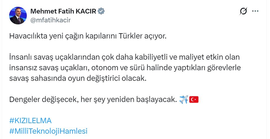 Sanayi ve Teknoloji Bakanı Mehmet Fatih Kacır, konuyla ilgili sanal medya hesabından açıklama yaptı. Kacır, "Havacılıkta yeni çağın kapılarını Türkler açıyor. İnsanlı savaş uçaklarından çok daha kabiliyetli ve maliyet etkin olan insansız savaş uçakları, otonom ve sürü halinde yaptıkları görevlerle savaş sahasında oyun değiştirici olacak. Dengeler değişecek, her şey yeniden başlayacak" dedi.