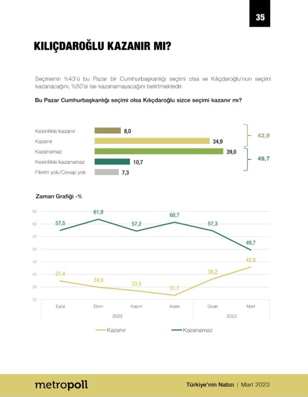 Metropoll Araştırma şirketi Mart 2023 Türkiye'nin Nabzı araştırmasının sonuçlarını yayınladı. Ankette seçmenlere 'Bu pazar Cumhurbaşkanlığı seçimi olsa Kemal Kılıçdaroğlu sizce kazanır mı?' sorusu soruldu. Anket sonuçlarına göre katılımcıların yüzde 34.9'u Kemal Kılıçdaroğlu için 'kazanır', yüzde8'i 'kesinlikle kazanır' dedi. Kılıçdaroğlu seçimi kazanamaz diyenlerin oranı ise yüzde 39, 'kesinlikle kazanamaz' diyenlerin oranı ise yüzde 10.7 çıktı.