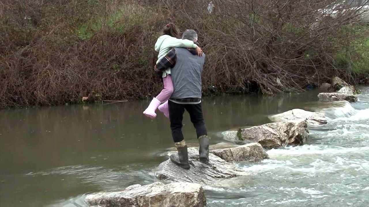 Çatalca'da kış aylarında taşan ve üzerinde o bölgede köprü bulunmayan dere nedeniyle mahalle sakinleri evlerine ulaşmakta zorlanıyor. Büyük risk alarak derenin üstündeki taşlara basarak karşıya geçmeye çalışan vatandaşlar, soruna çözüm bulunmasını istiyor.