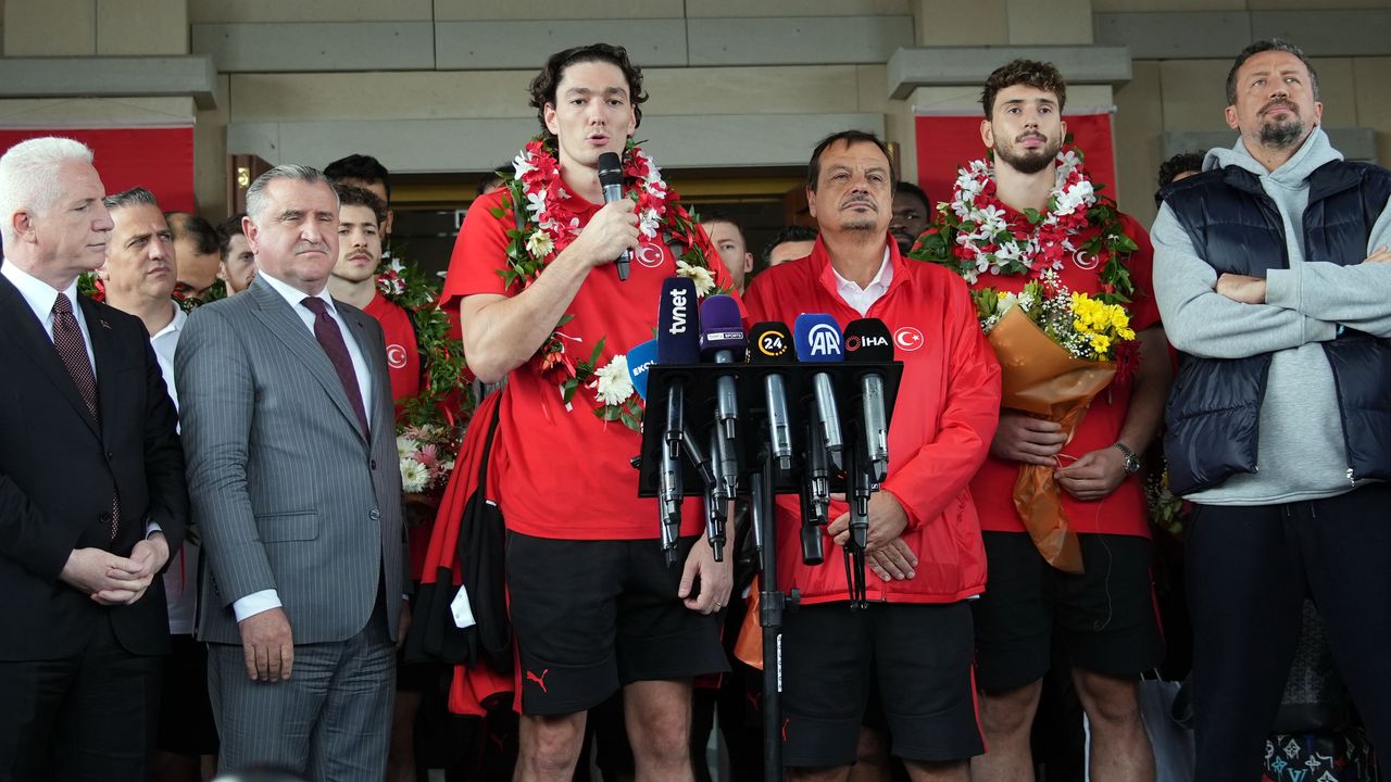 A Milli Erkek Basketbol Takımı, Letonya’nın başkenti Riga’da düzenlenen 2025 Avrupa Basketbol Şampiyonası'nın (EuroBasket 2025) finalinde Almanya’ya 88-83’lük skorla yenilerek Avrupa ikincisi oldu. Avrupa şampiyonası tarihinde ikinci kez gümüş madalya kazanan 12 Dev Adam, organizasyonun ardından bugün Türkiye’ye döndü. Havalimanından çıkışın ardından milli basketbolcular Cedi Osman ve Alperen Şengün, basın mensuplarına açıklamalarda bulundu.