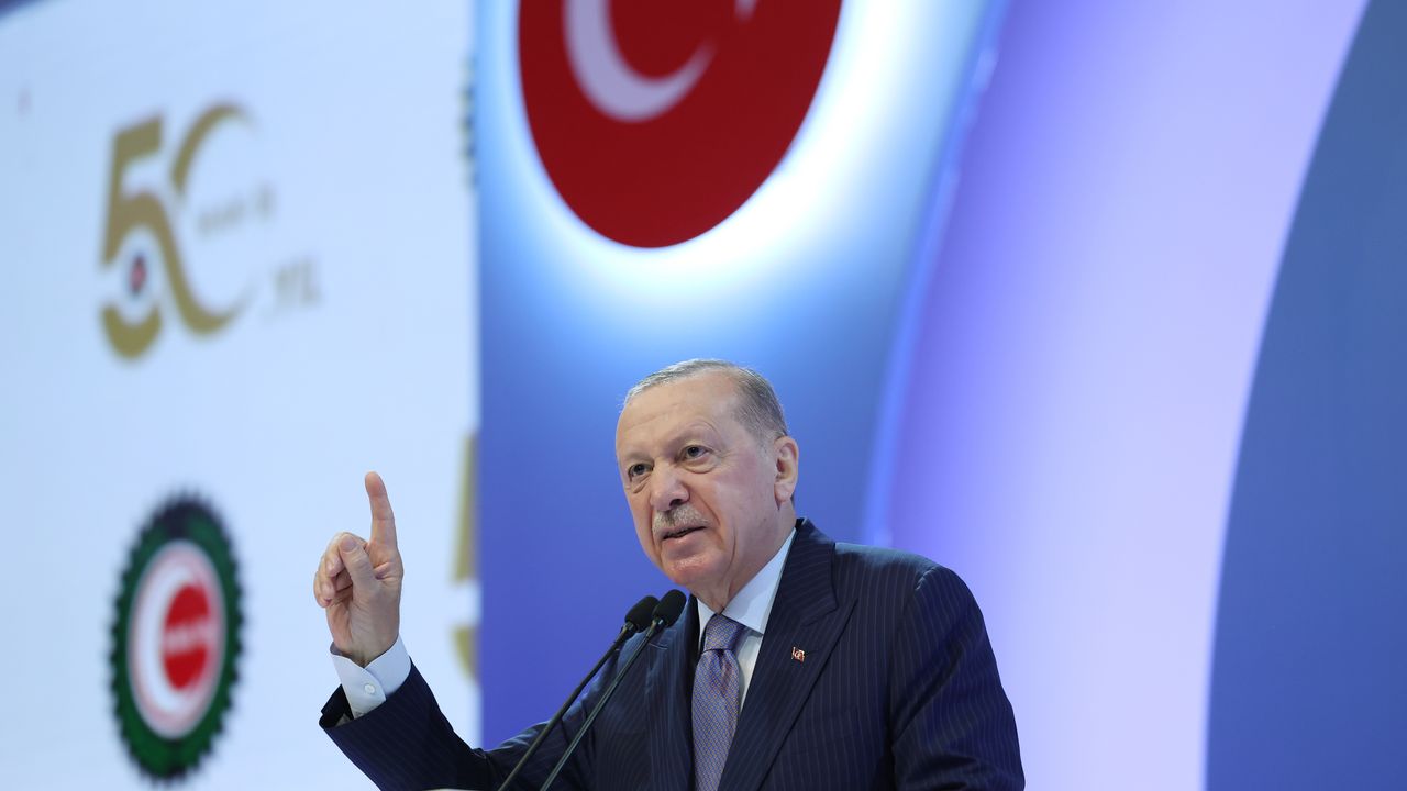 Cumhurbaşkanı Erdoğan, Hak İşçi Sendikaları Konfederasyonu (HAK-İŞ) 50'nci Yıl Etkinlikleri Kapsamında Ankara Ticaret Odası (ATO) Kongre ve Sergi Merkezi'nde düzenlenen '1'inci Türkiye Buluşması Programı'na katıldı. Burada konuşan Erdoğan, 50'nci yılın HAK-İŞ camiası ile sendikalar, emekçiler, çalışma hayatı, ülke ve millet için hayırlı olmasını dileyerek, "Türkiye'de kardeş kavgasının zirve yaptığı bir dönemde, bir nevi kardeşlik ve barış ocağı olarak kurulan HAK-İŞ Konfederasyonu'nun faaliyetlerinde emeği geçen herkesi yürekten tebrik ediyorum. HAK-İŞ çatısı altında emekçinin davasını; hakkın, hakikatin ve adaletin davasını savunanlardan ebedi aleme göç edenlere Rabb'imden gani gani rahmet niyaz ediyorum. HAK-İŞ’in eski Genel Başkanı, Çalışma Bakanımız, kıymetli yol ve dava arkadaşımız Necati Çelik’i bir kez de sizlerin huzurunda minnetle anıyorum. Hayatta olan dostlarımıza, büyüklerimize ve kardeşlerimize hayırlı, uzun, bereketli ömürler temenni ediyorum. Yine bu vesileyle özellikle iş kazalarında yitirdiğimiz işçi kardeşlerimizi rahmetle yad ediyor, Allah onlardan da razı olsun diyorum. HAK-İŞ bünyesinde örgütlü sendikal mücadeleye katılan 81 ilimizdeki 850 bin kardeşimin her birine buradan selam ve muhabbetlerimi gönderiyorum" dedi.