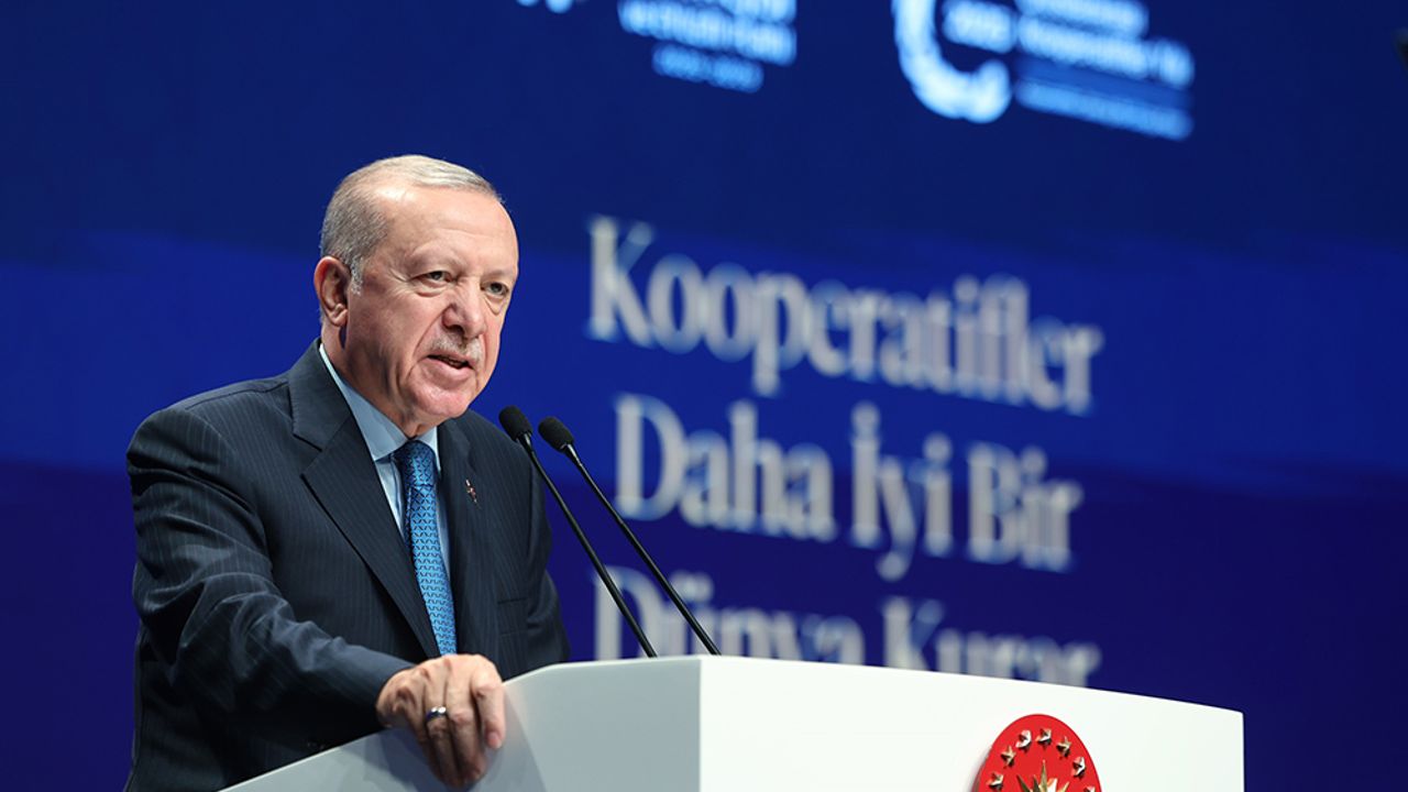 Türkiye'de 6,5 milyonu aşkın vatandaşın ortağı olduğu 62 bin kooperatifin faaliyet gösterdiğini kaydeden Cumhurbaşkanı Erdoğan, "Bunu Türkiye'nin ticari ve ekonomik hayatı adına çok kıymetli bir kazanım olarak gördüğümüzü hassaten ifade ediyorum. Ancak Avrupa Birliği'nde 165 milyonu aşkın kooperatif ortağı ile 250 bin kooperatif olduğu düşünüldüğünde, bu alanda henüz arzu edilen seviyede olduğumuzu ne yazık ki söyleyemeyiz. Dikkate değer bir başka husus şudur. Kooperatifler sadece ülkemizde değil, son yıllardır dünyada da ön plana çıkmaya başlamıştır. Vahşi kapitalizmin acımasız dişlileri arasında ezilmek istemeyen yerel üreticiler, güvenli bir limanı olarak kooperatiflere sığınıyor. Bilhassa bütçe, network, teknolojik kapasite itibariyle pek çok devleti geride bırakan küresel şirketlerle rekabette, değil bireyler, değil makro işletmeler, yerel ölçekte büyük firmalar bile çoğu zaman yetersiz kalıyor. Belli başlı alanlarda tekelleşen bu şirketlerin agresif fiyat politikalarıyla küçükleri yuttuğuna şahit oluyoruz. Giderek daha ürkütücü boyutlara ulaşan bu durum, kooperatifçiliği teşvik eden temel faktördür. Şu rakamlar, küresel düzeyde bir arayışın en somut işaretidir. Uluslararası Kooperatif Birliği'nin verilerine göre, dünya genelinde 3 milyon kooperatif bulunuyor. Dünya nüfusunun yüzde 12'si bir kooperatifin iş ortağıdır. Kooperatiflerin toplam cirosu ise 2,4 trilyon doları geçiyor. 2025 yılının Birleşmiş Milletler tarafından Uluslararası Kooperatifler Yılı ilan edilmesini bu bakımdan çok yerinde bir karar olarak görüyoruz" dedi.