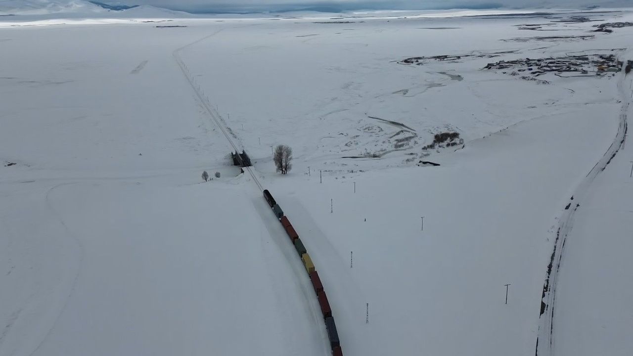 Bakü-Tiflis-Kars (BTK) demiryolu hattı, kış mevsiminin tüm güzelliğiyle birleşince ortaya eşsiz manzaralar çıktı. Orta Asya’nın derinliklerinden yüklenen vagonlar, Türkiye üzerinden Avrupa’ya uzanan binlerce kilometrelik yolculuğun en zorlu ve en görkemli etaplarından birini Kars’ta geride bırakıyor. Kars'ın Selim ilçesi sınırlarında yer alan tarihi Benliahmet İstasyonu, bu devasa yolculuğun en önemli duraklarından biri oldu. Gökyüzünün masmavi rengiyle birleşen bembeyaz kar örtüsü, yeşil çam ağaçlarıyla birleşince ortaya çıkan kontrast, dron kamerasınca saniye saniye kaydedildi. Adeta karların üzerinde dans edercesine ilerleyen yük treni, Doğu Anadolu’nun sert ama mağrur coğrafyasında yoluna devam ediyor.