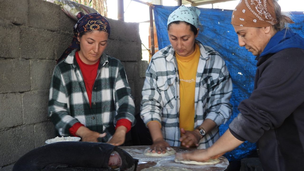 Hatay'ın Samandağ ilçesinde depremzede kadınlar, kendi sıkıntılarını bir kenara bırakarak diğer depremzedeler için ekmek yapıyor.