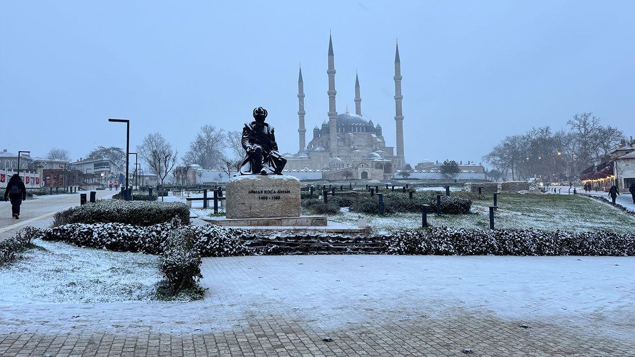 Balkanlar üzerinden gelen soğuk hava dalgasıyla birlikte Edirne’de kar yağışı başladı. Kısa sürede etkisini gösteren yağışla birlikte cadde ve sokaklar beyaza bürünürken, tarihi Selimiye Camii çevresinde kar manzarası mest etti. Yağışın öğle saatlerine kadar yer yer kuvvetli şekilde devam etmesi bekleniyor.