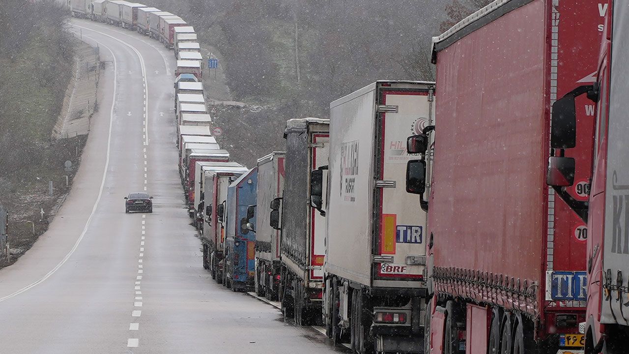 Edirne'de Hamzabeyli Sınır Kapısı'nda dondurucu soğuk etkisini artırırken, yurt dışına çıkmak isteyen tırlar kilometrelerce kuyruk oluşturdu.