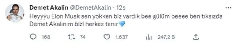 Daha önce iki kez ertelenen 'paralı mavi tik' uygulaması 20 Nisan akşamı devreye girmesinin ardından Twitter'da 6.7 milyon takipçisi bulunan şarkıcı Demet Akalın, bu duruma tepki göstererek; "Heyyyu Elon Musk, sen yokken biz vardık be gülüm. Ben tıksız da Demet Akalın'ım, bizi herkes tanır" mesajını paylaşmıştı.