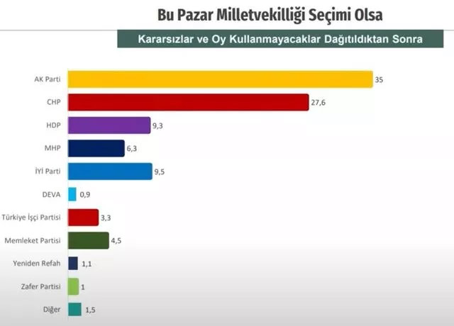 En son seçim anketi sonuçları geldi. En son seçim anketi sonuçlarını yayınlayan şirket Yöneylem oldu. 14 Mayıs seçimlerine 35 gün kala yapılan Yöneylem seçim anketinde seçmenlere 'Bu pazar seçim olsa hangi partiye oy verirsiniz?' sorusu soruldu. Yöneylem en son seçim anketi sonuçlarına göre, AK Parti oy oranı yüzde 35, CHP oy oranı yüzde 27,6, İYİ Parti oy oranı yüzde 9.5, MHP oy oranı yüzde 6.3, Memleket Partisi oy oranı yüzde 4.5, Türkiye İşçi Partisi-TİP oy oranı yüzde 3,3, Yeniden Refah Partisi oy oranı yüzde 1,1, Zafer Partisi oy oranı yüzde 1, DEVA Partisi oy oranı yüzde 0,9, Diğer partiler oy oranı ise yüzde 1.5 olarak belirlendi.