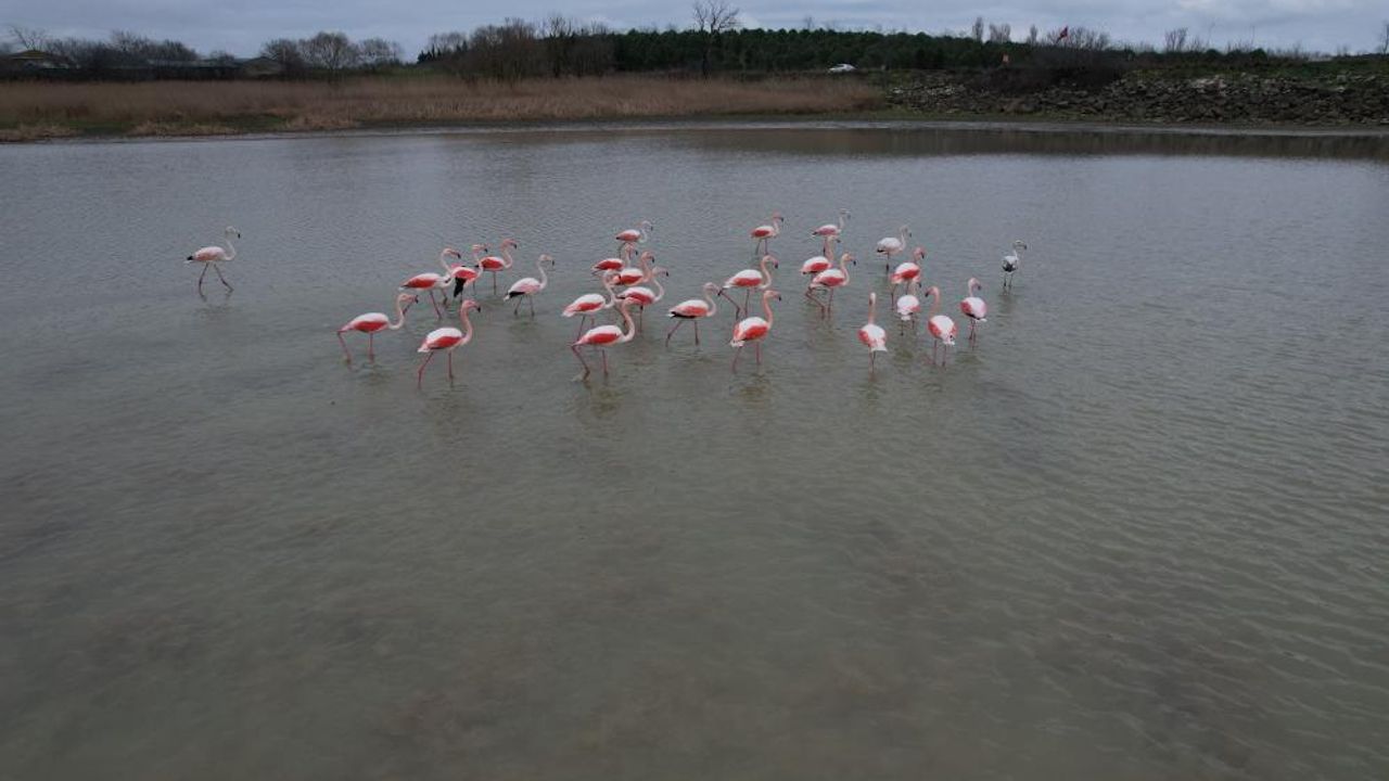 Doğal güzelliğiyle dikkat çeken Büyükçekmece Gölü'nde beslenen flamingoların oluşturduğu manzara, izleyenlere görsel şölen sundu. Sabah saatlerinde kaydedilen dron görüntülerinde flamingoların göl yüzeyinde toplu halde dolaştığı ve zaman zaman uçuş yaptığı anlar yer aldı.