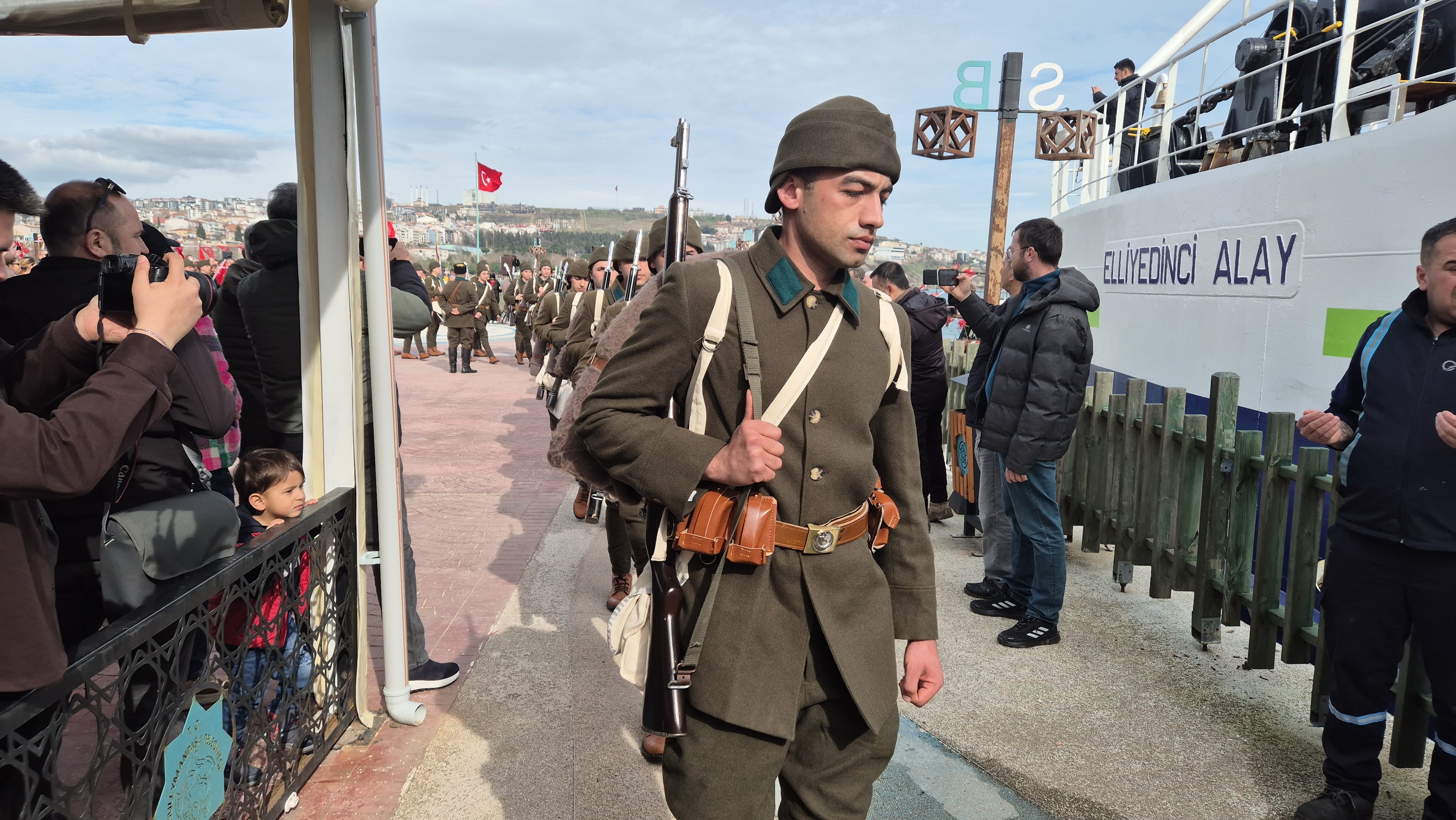 Programın en etkileyici anları ise saat 14.30’da Rumeli İskelesi’nde yaşandı. Dönemin askeri kıyafetlerini giyen temsili Mehmetçikler, halkın alkışları ve dualar eşliğinde Elli Yedinci Alay isimli feribota bindi. Limandan ayrılan feribota, denizde Türk bayraklarıyla kortej oluşturan balıkçı tekneleri eşlik etti. 111 yıl önceki tarihi yolculuğun bu sembolik canlandırması izleyenlere duygu dolu anlar yaşattı.