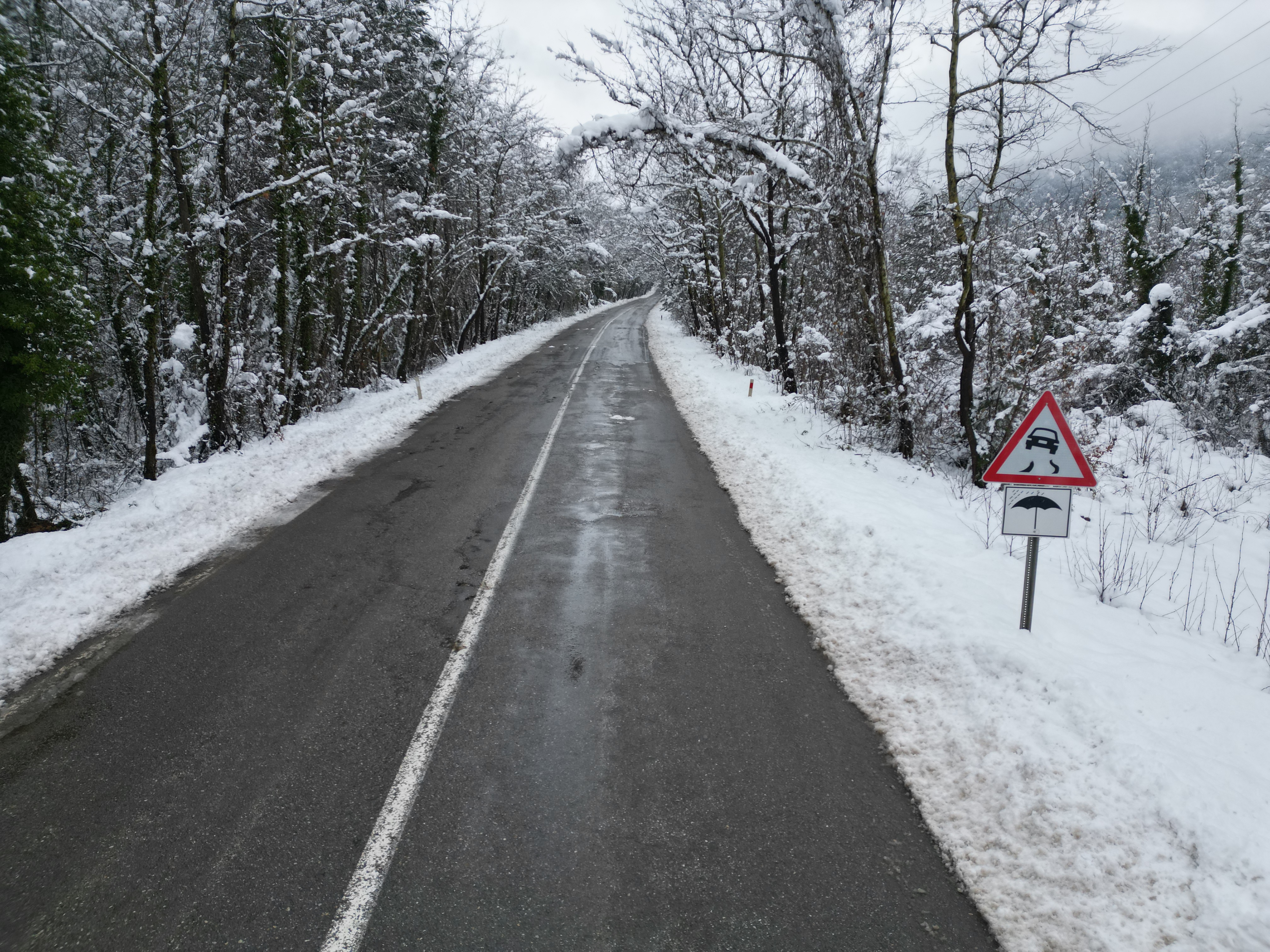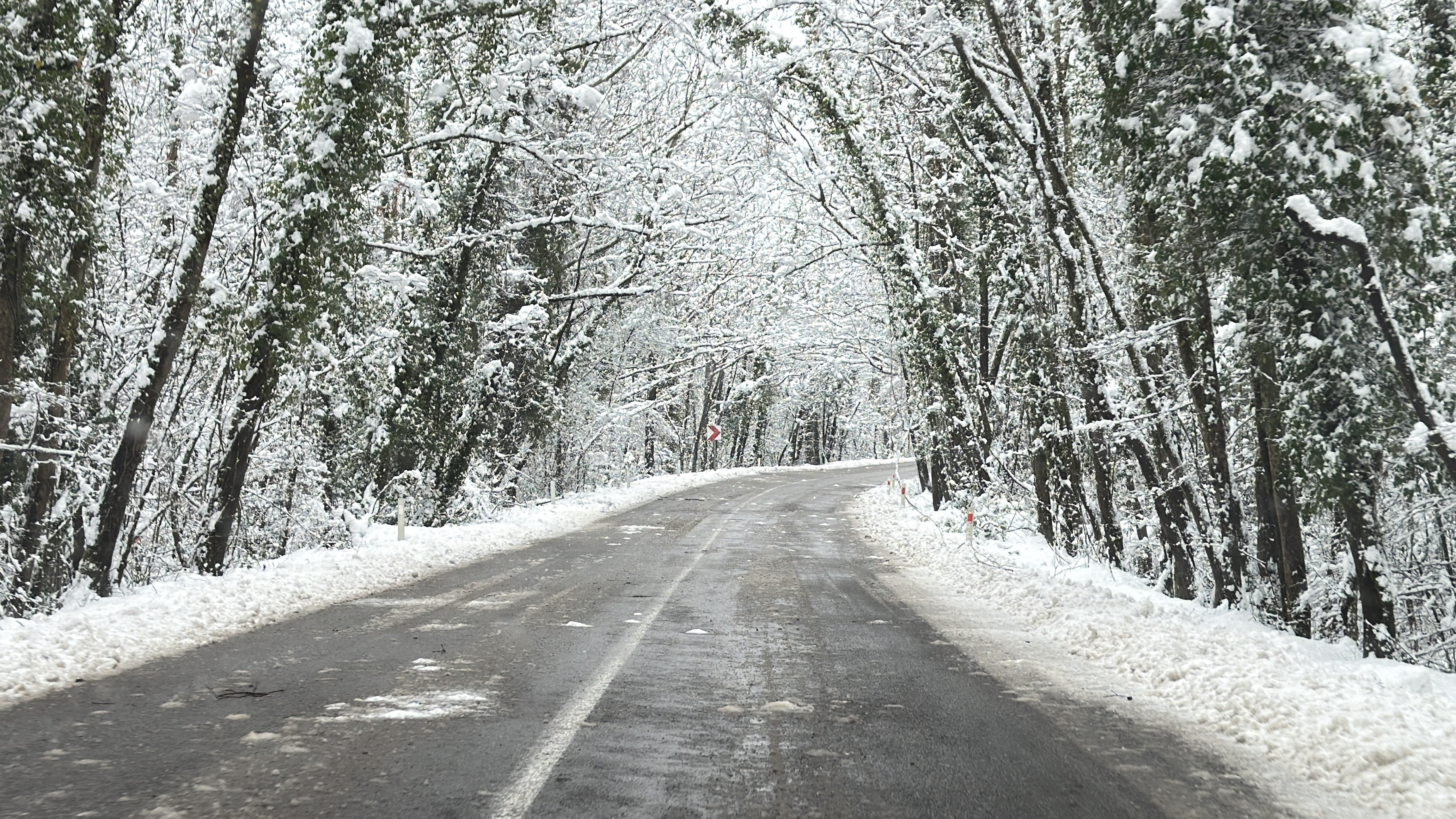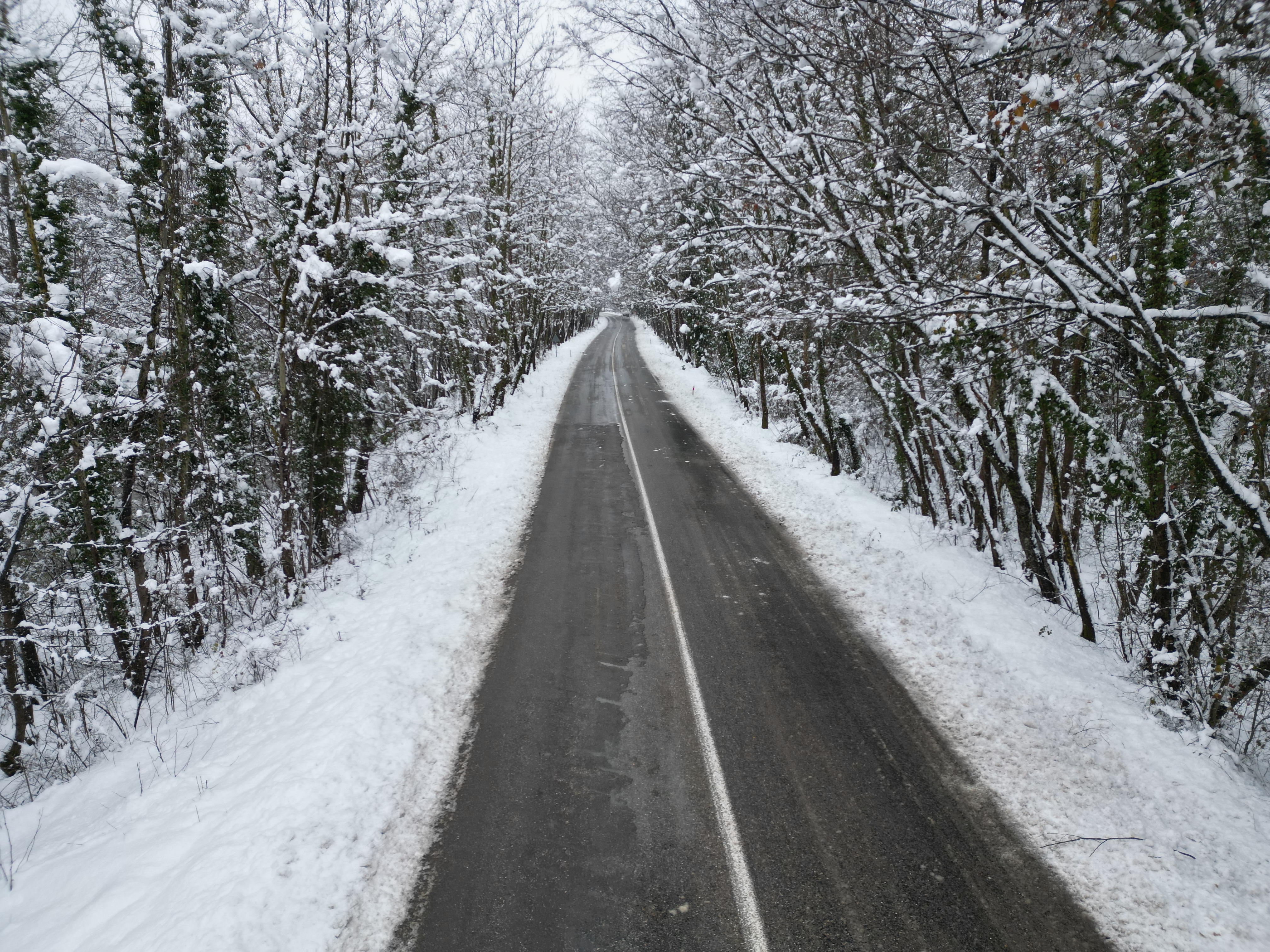 Sürücüler, karla kaplı ağaçların arasında keyifle yolculuk yaptı. Yolun karla kaplı eşsiz manzarası dron ile görüntülendi.