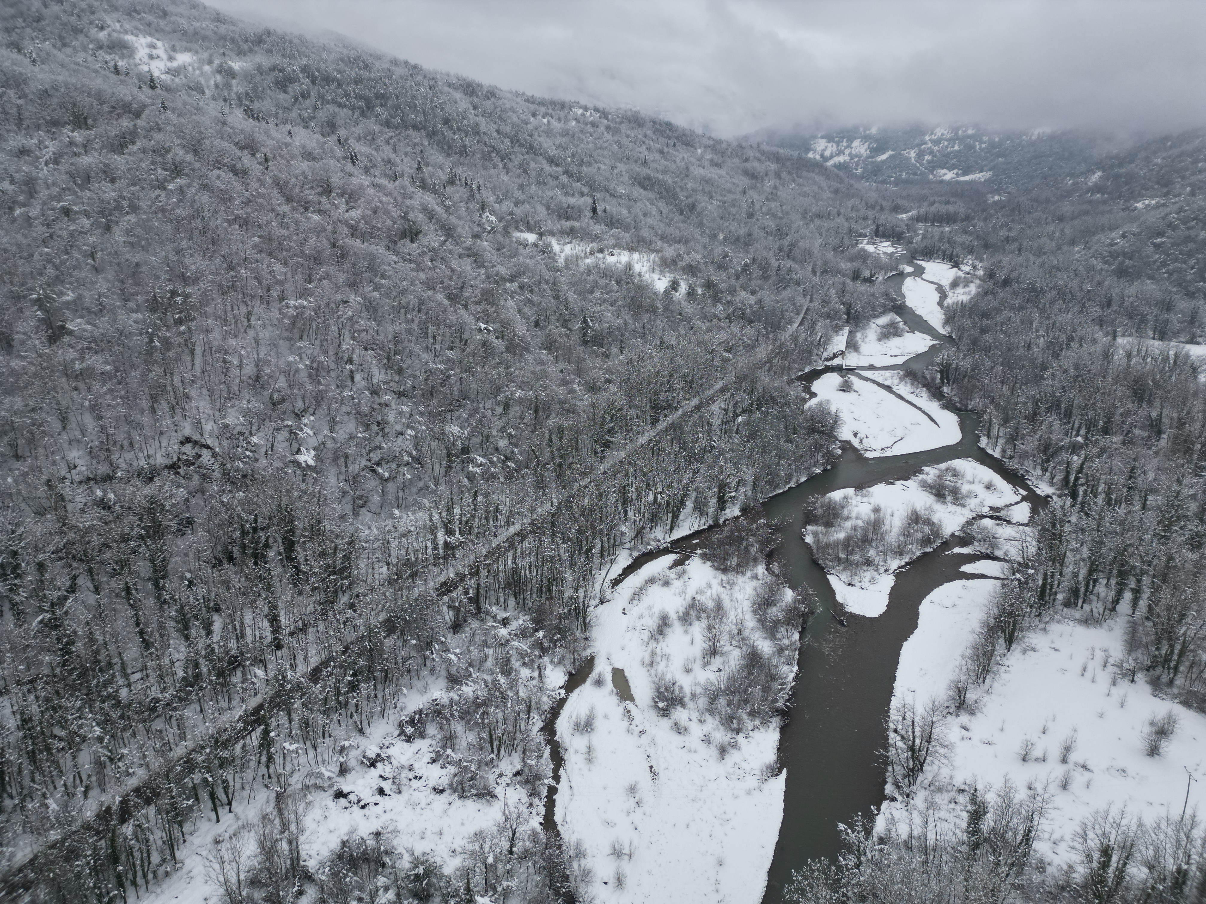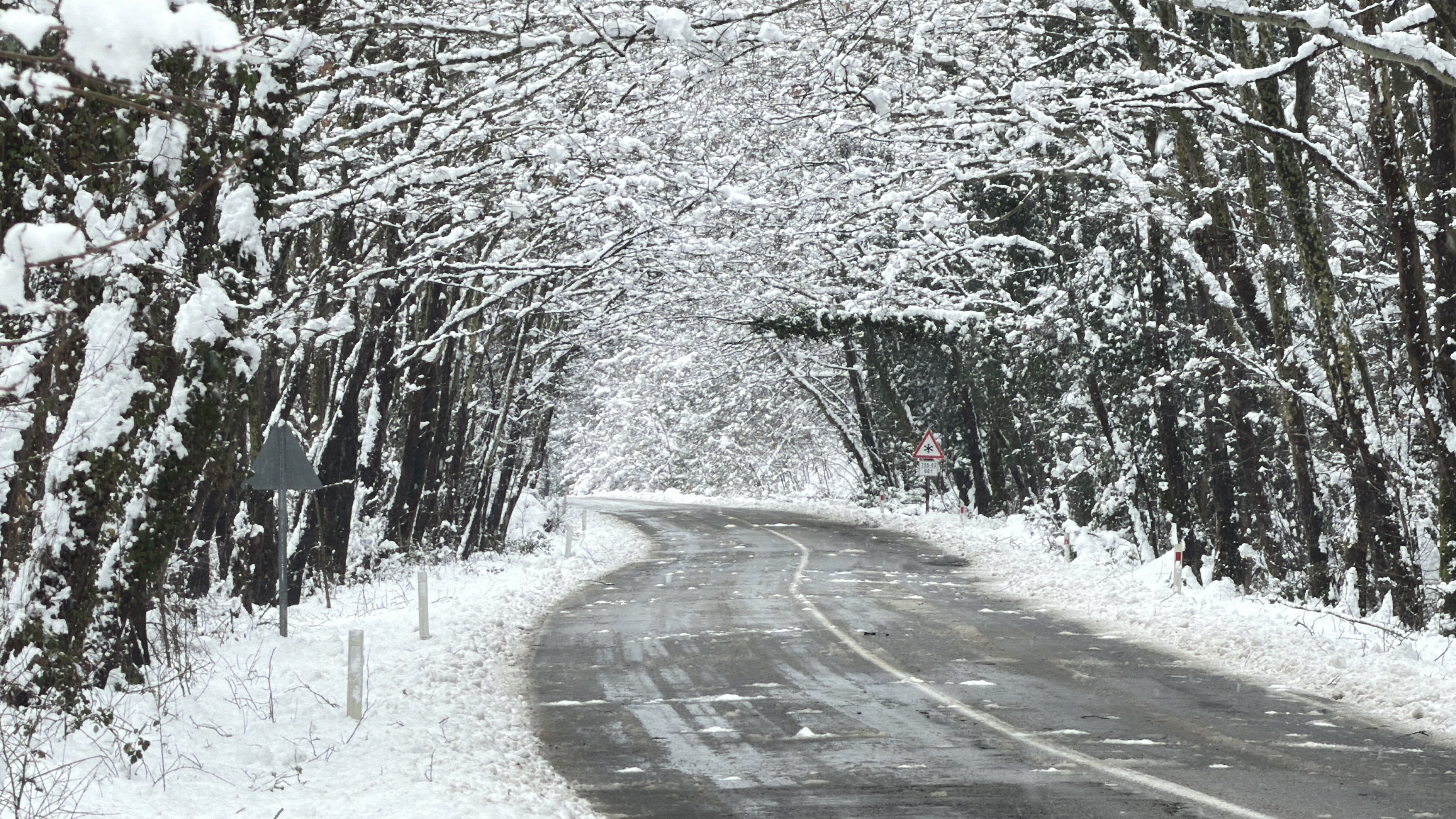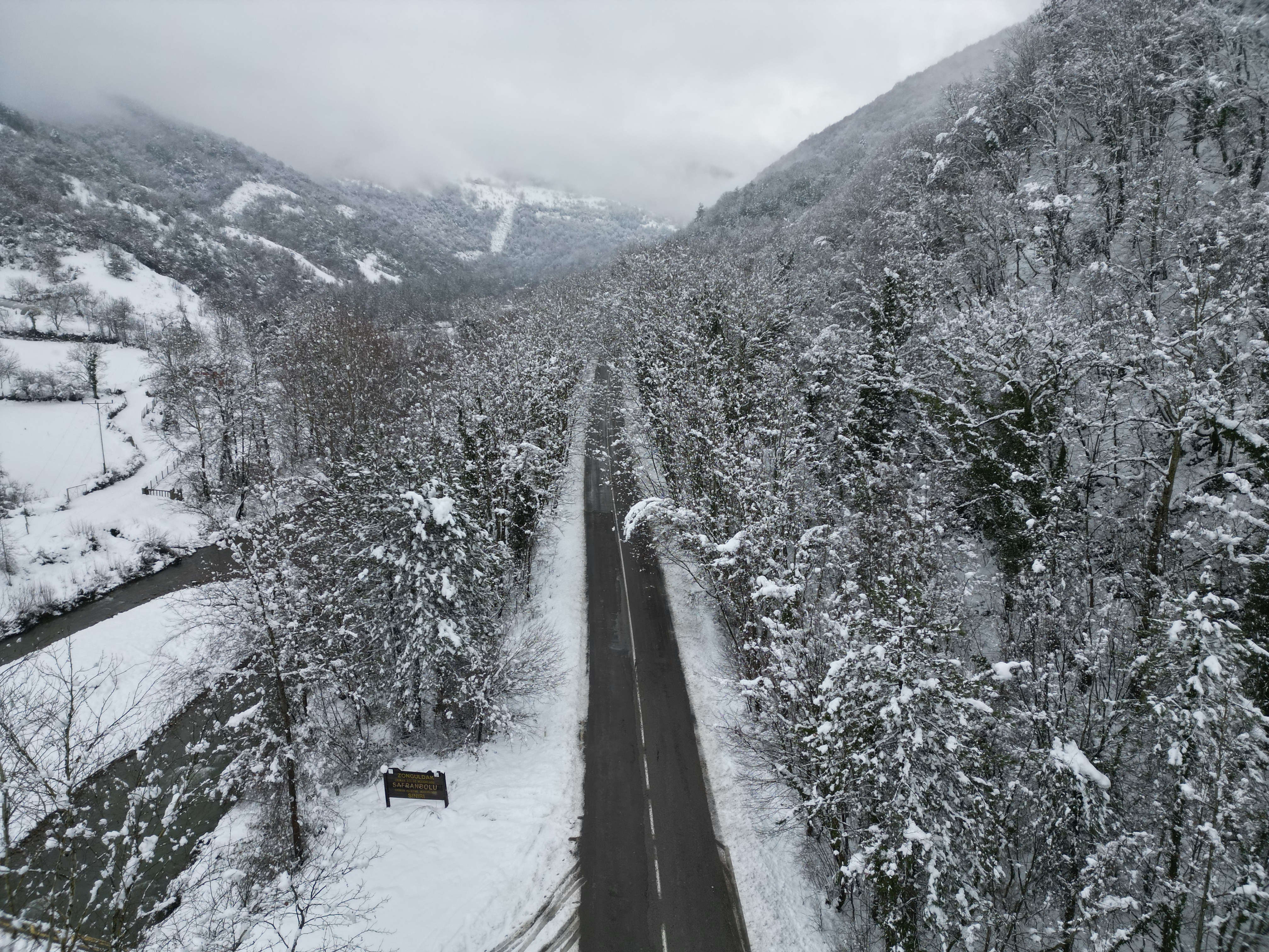 Bartın ile Karabük arasında iki tarafı ağaçlarla kaplı olan ve 'Ağaç tünel yol' olarak bilinen kara yolunda, kar yağışıyla birlikte ortaya çıkan manzara, dron ile görüntülendi.