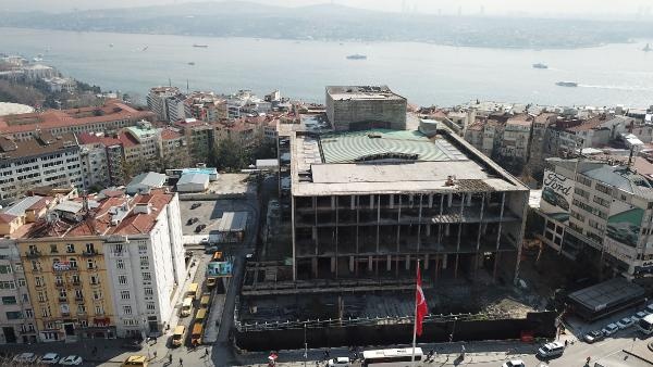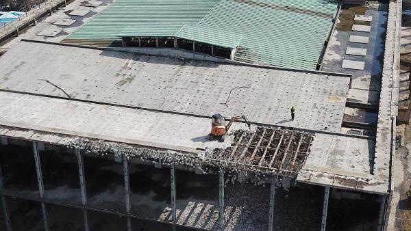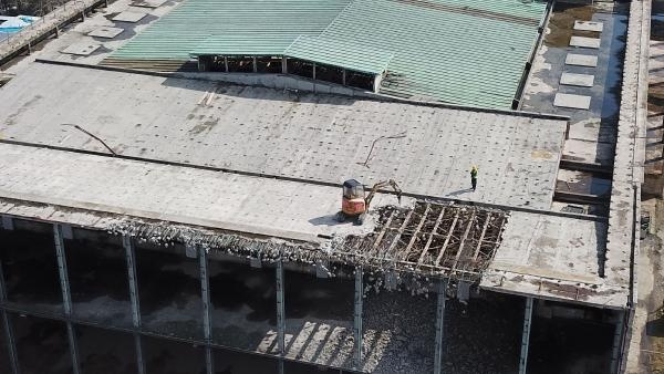 Daha önce cam ve çerçeveleri sökülen AKM'de dün sabah çatıya çıkarılan iş makinesiyle yıkım başlamıştı. Etrafı yüksek bir perde ile kapatılan AKM'de beton kırma makinesiyle çatıdaki yıkım çalışmaları devam ediyor.