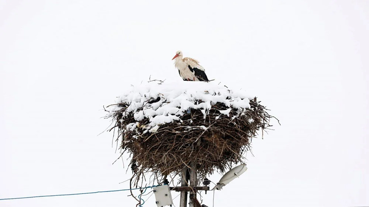 İlkbahar mevsiminin müjdecisi olarak bilinen leylekler, mart ayının ilk haftası itibarıyla Muş’a gelen leyleklerin yuvası karla kaplandı.