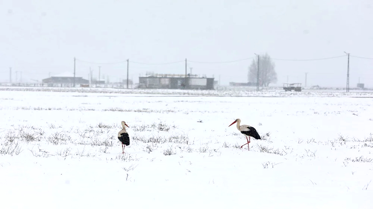 Yuvaları karla kaplanan leylekler, ovada yiyecek aradı.
