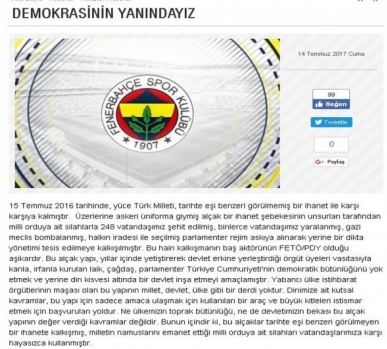 Fenerbahçe resmi internet sitesinden konuyla ilgili “Demokrasinin Yanındayız” başlıklı paylaşım yapıldı.