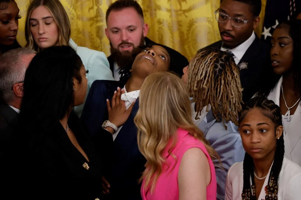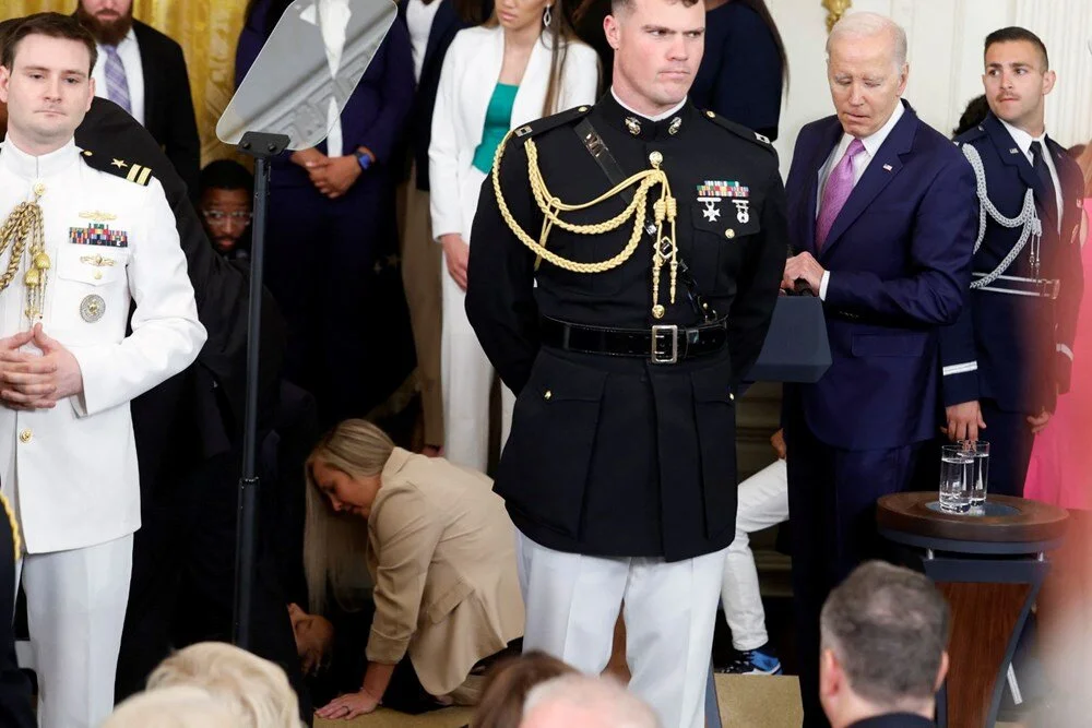 Biden'ın burada yaptığı konuşma sırasında kürsünün hemen arkasında başkanı dinleyen sporculardan Sa'Myah Smith'in bayılması paniğe neden oldu.