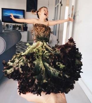Pek çok sebze, meyve ve çiçeği, perspektifin gücünden faydalanarak Stefani’nin üzerinde şık kıyafetlere çeviriyor.