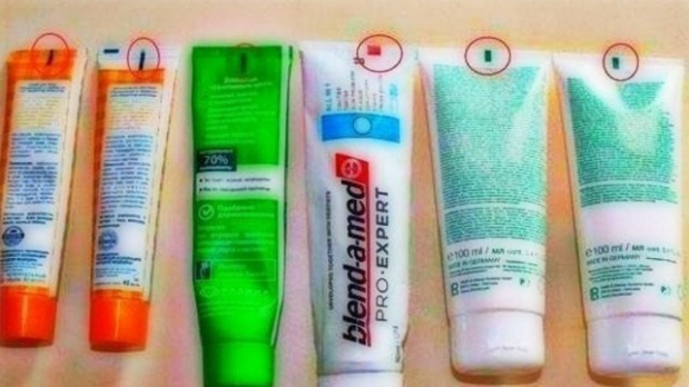 Bu renkler, ürünlerin paketleme süreçlerinde işe yarıyor. Makinelere, diş öacunu tüpünü, nerden kıvırmaları nereden kesmeleri gerektiğini söylüyorlar. Renklerin farklılık göstermesi ise, makine sensörlerinin paketleme kolaylığı ile ilgili...