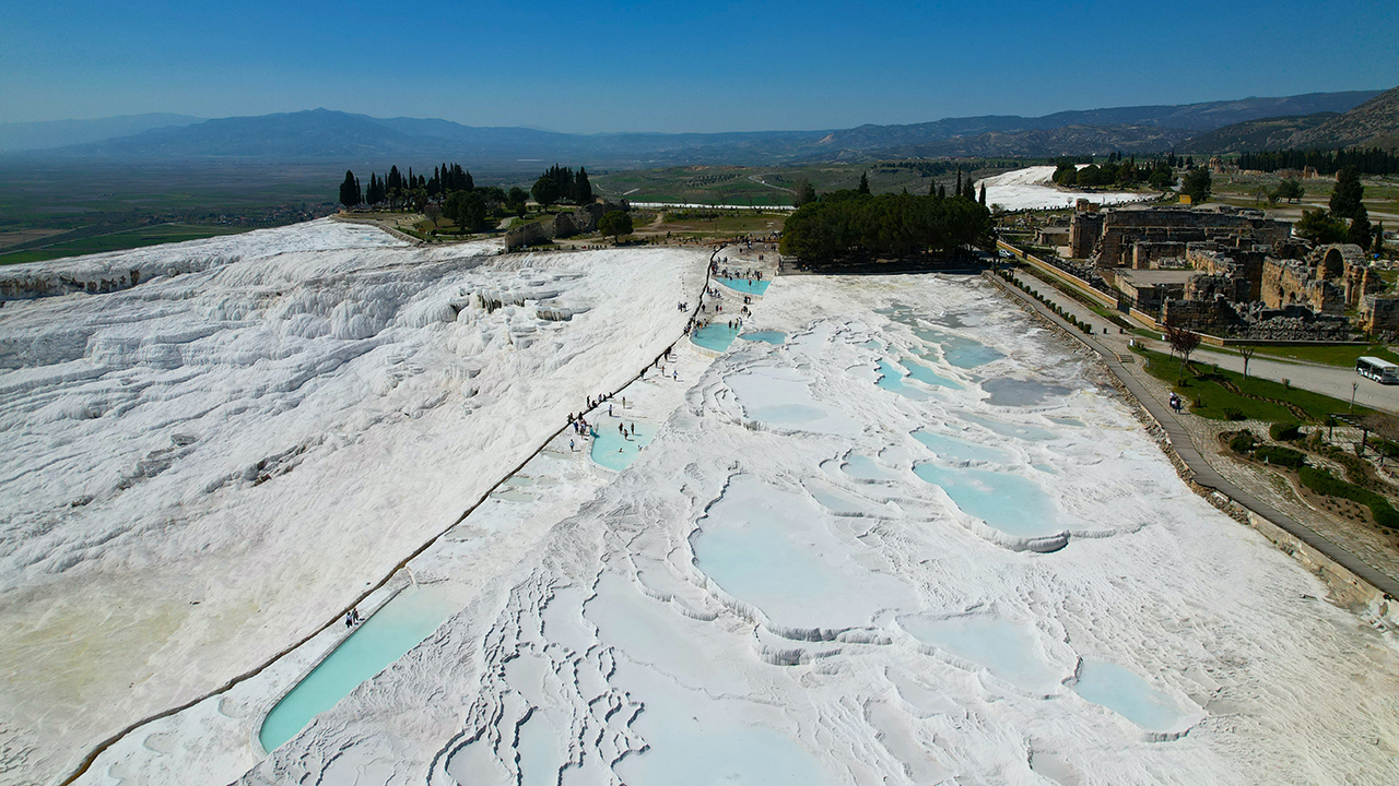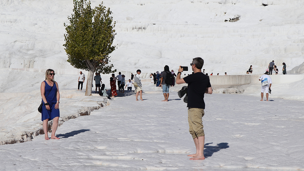 Hava sıcaklıklarının artmasını fırsat bilen yerli ve yabancı turistler travertenlere kendilerini atarak doyasıya vakit geçirdi. Bahar tatili için Pamukkale'yi tercih eden vatandaşlar, güzelliği ile görenleri cezbeden bembeyaz travertenlerin üzerinde ve Hierapolis Antik Kentinin eşsiz doğasında gezintinin tadını çıkardı