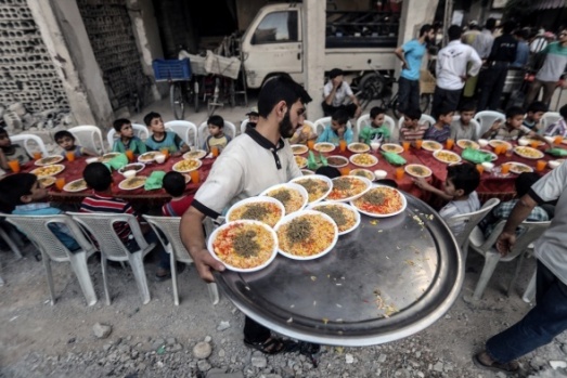 HAVA SALDIRILANRINDA HASAR GÖRMÜŞ EVLERİN YANINDA KURULAN İFTAR YEMEĞİ İÇİN TABAK TAŞIYAN BİR SURİYELİ (DOUMA)