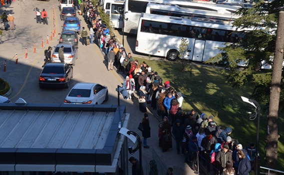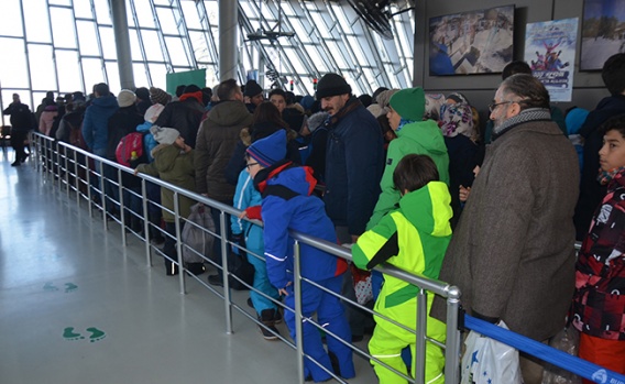 Yarı yıl ve hafta sonu tatili sebebiyle Uludağ'a akın edenler, dağ yolundaki yoğun kar sebebiyle teleferiğe akın etti. Teleferik kuyruğu ana yola kadar uzandı.