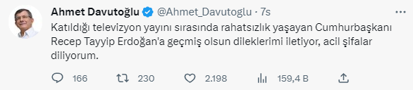 Gelecek Partisi Genel Başkanı Ahmet Davutoğlu, "Katıldığı televizyon yayını sırasında rahatsızlık yaşayan Cumhurbaşkanı Recep Tayyip Erdoğan'a geçmiş olsun dileklerimi iletiyor, acil şifalar diliyorum" dedi.
