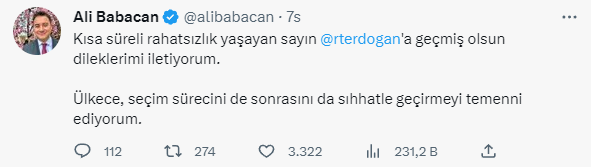 DEVA Partisi Genel Başkanı Ali Babacan, "Kısa süreli rahatsızlık yaşayan sayın Erdoğan'a geçmiş olsun dileklerimi iletiyorum. Ülkece, seçim sürecini de sonrasını da sıhhatle geçirmeyi temenni ediyorum" ifadesini kullandı.
