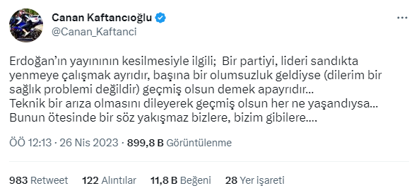 CHP İstanbul İl Başkanı Canan Kaftancıoğlu ise "Erdoğan'ın yayınının kesilmesiyle ilgili;Bir partiyi, lideri sandıkta yenmeye çalışmak ayrıdır, başına bir olumsuzluk geldiyse (dilerim bir sağlık problemi değildir) geçmiş olsun demek apayrıdır… Teknik bir arıza olmasını dileyerek geçmiş olsun her ne yaşandıysa… Bunun ötesinde bir söz yakışmaz bizlere, bizim gibilere…." dedi.