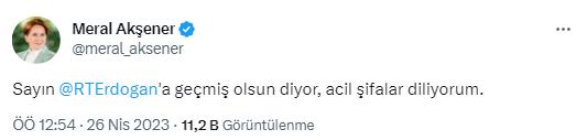 Kılıçdaroğlu'nun ardından paylaşım yapan İYİ Parti lideri Meral Akşener ise "Sayın Erdoğan'a geçmiş olsun diyor, acil şifalar diliyorum" ifadelerini kullandı.