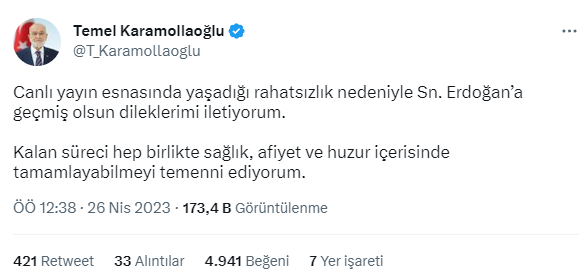 Saadet Partisi lideri Temel Karamollaoğlu, "Canlı yayın esnasında yaşadığı rahatsızlık nedeniyle Sn. Erdoğan'a geçmiş olsun dileklerimi iletiyorum. Kalan süreci hep birlikte sağlık, afiyet ve huzur içerisinde tamamlayabilmeyi temenni ediyorum" ifadesini kullandı.