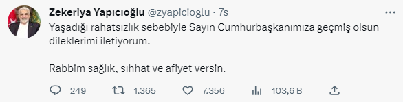 Cumhur İttifakı ortağı HÜDAPAR Genel Başkanı Zekeriya Yapıcıoğlu "Yaşadığı rahatsızlık sebebiyle Sayın Cumhurbaşkanımıza geçmiş olsun dileklerimi iletiyorum. Rabbim sağlık, sıhhat ve afiyet versin" mesajını paylaştı.