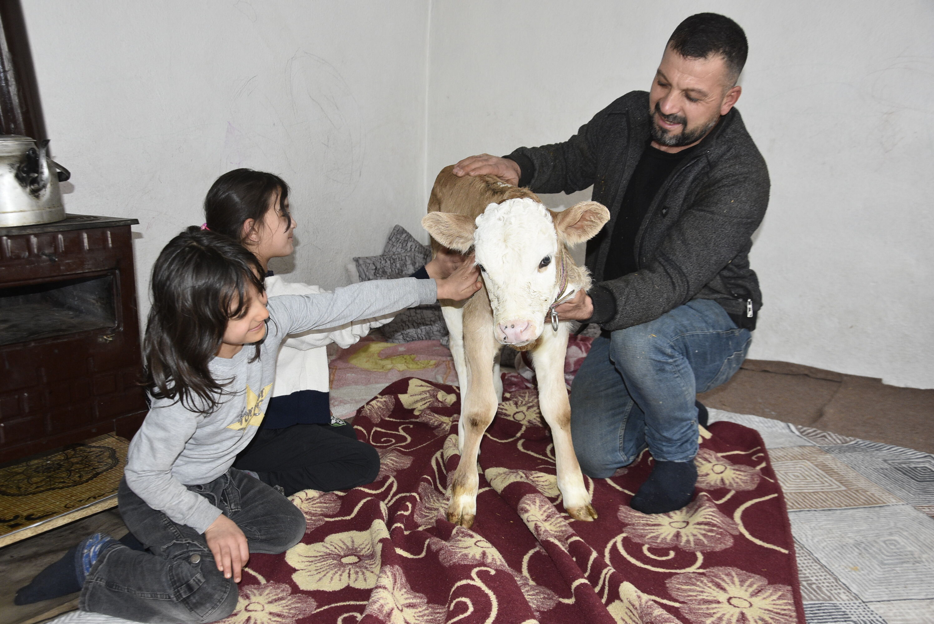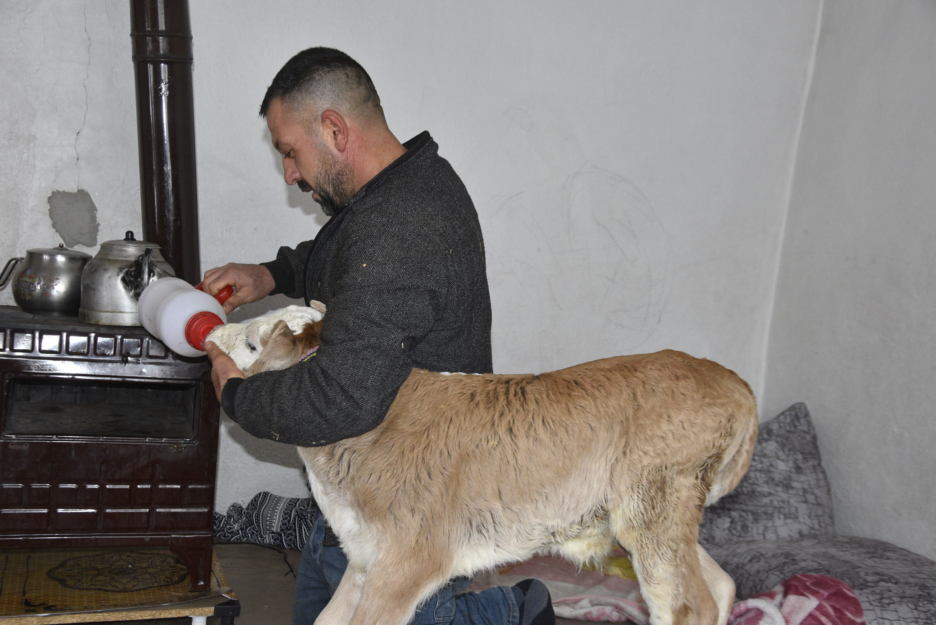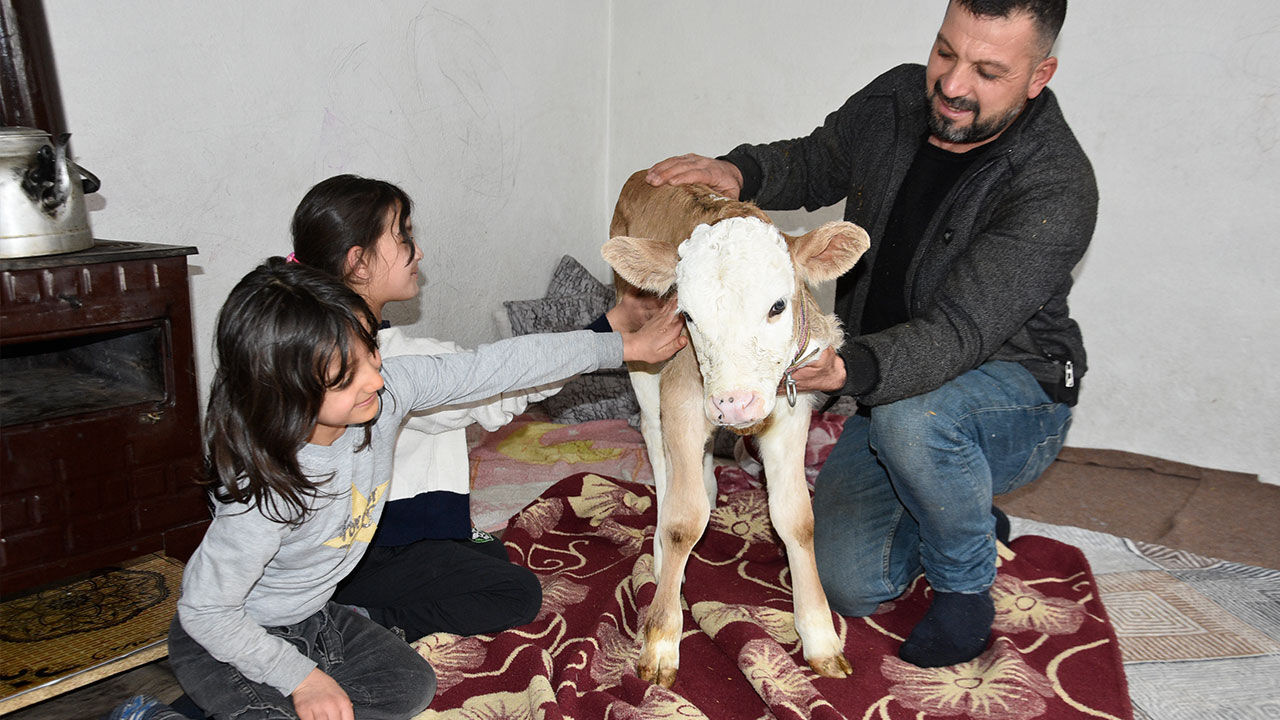 Çetin Aygül, soğuk hava nedeniyle hayvanı eve aldıklarını belirterek, “Buzağımız henüz çok küçük ve hasta. Havalar oldukça soğuk olduğu için üşümemesi için onu eve aldık. Sobanın yanında ona özel bir yer hazırladık. Adeta bir bebek gibi bakımını yapıyoruz" diye konuştu.