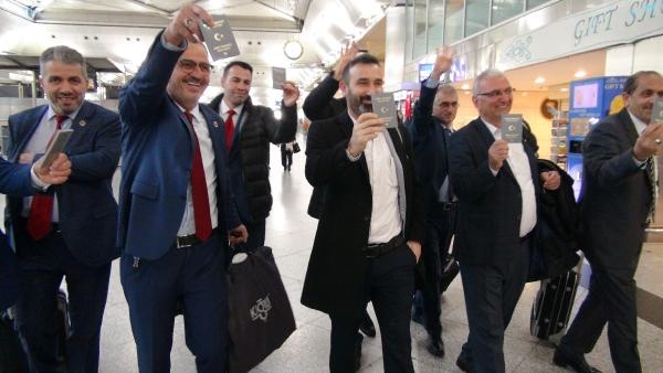Muhtarlar kendilerine verilen gri renkli hizmet pasaportuyla kameralara poz verirken el sallayarak yolculuklarına başladılar.