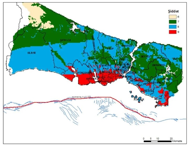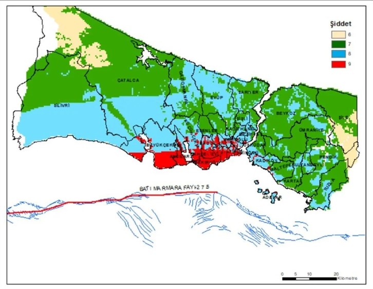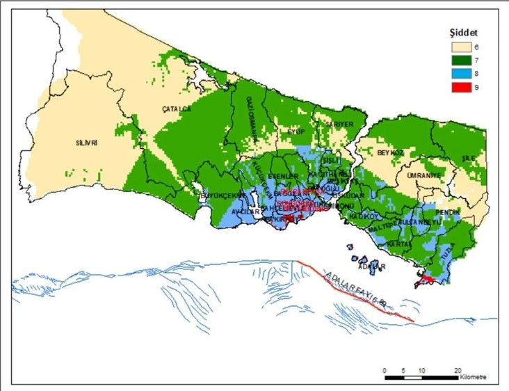 "Senaryo-1: Sadece Adalar fayı kırılırsa 6.9 büyüklüğünde deprem beklenir (Şiddet değil). Tuzla ve Adalar'da zayıf zeminlerde yerel olarak IX şiddet değerlerine ulaşılır."