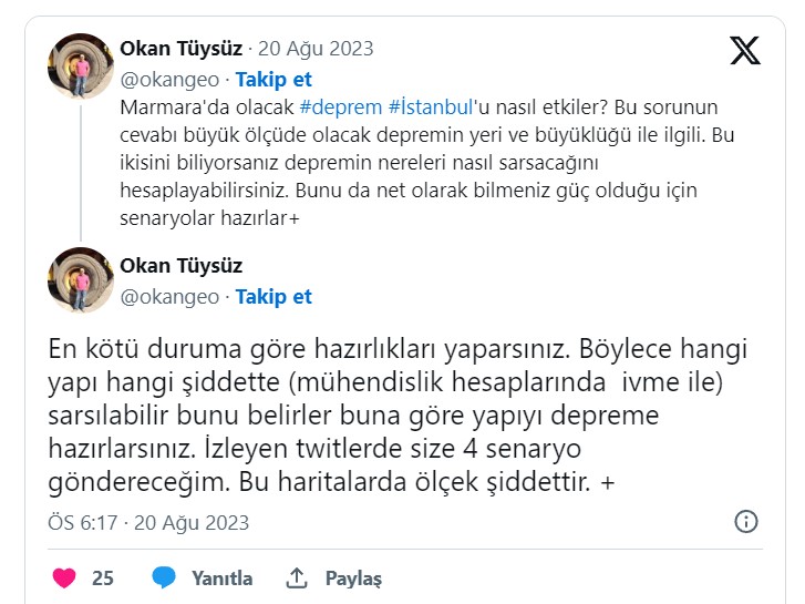 Marmara'da olması beklenen depremin, İstanbul'a etkisini 4 senaryo ile paylaşan Tüysüz, "Bu haritaları sizi korkutmak amacı ile hazırlamadım, olasılıkları bilmek hazırlığın ilk aşamasıdır, amacım bilgilendirmek. Senaryolarda zaman faktörü yoktur, bugün yarın deprem olacak gibi algılanmasın. Bilinmezlikler ve farklı yorumlar çok fazladır." açıklamasını da not düştü.